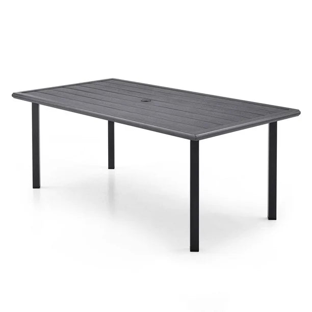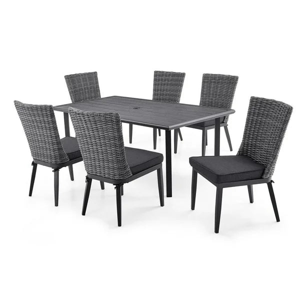 Lounge, lunch, and linger from the comfort of the hometrends Asteri Dining Set. The all-weather design features handwoven resin wicker wrapped around heavy-duty, rust-resistant steel frames—all crafted to stand up to plenty of sunny days spent outside. It also includes UV-resistant fabric, so you know this leisurely and versatile set is designed for long-lasting use. An all-season resinwood tabletop and plush seat cushions complete the set to create a casually comfortable spot for outdoor dining. The table also has a hole to accommodate an umbrella (sold separately), so you can get as much or as little sun as you need while you dine.