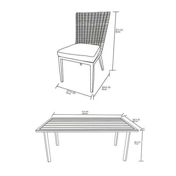 - Dining Table measures 73 in. W x 39.2 in. D x 28 in. H.