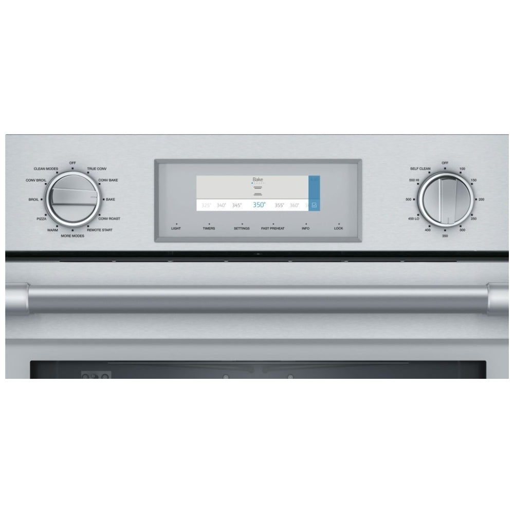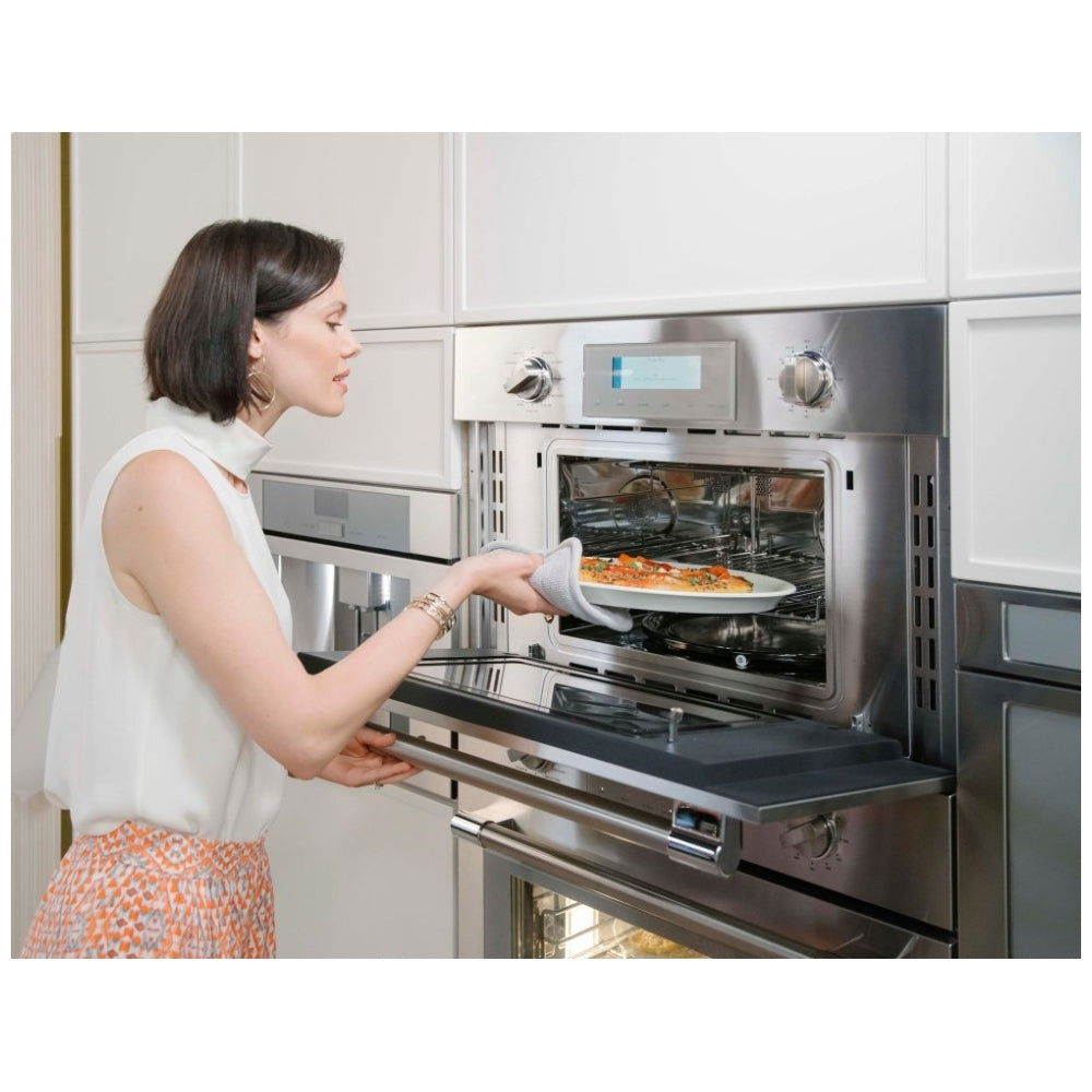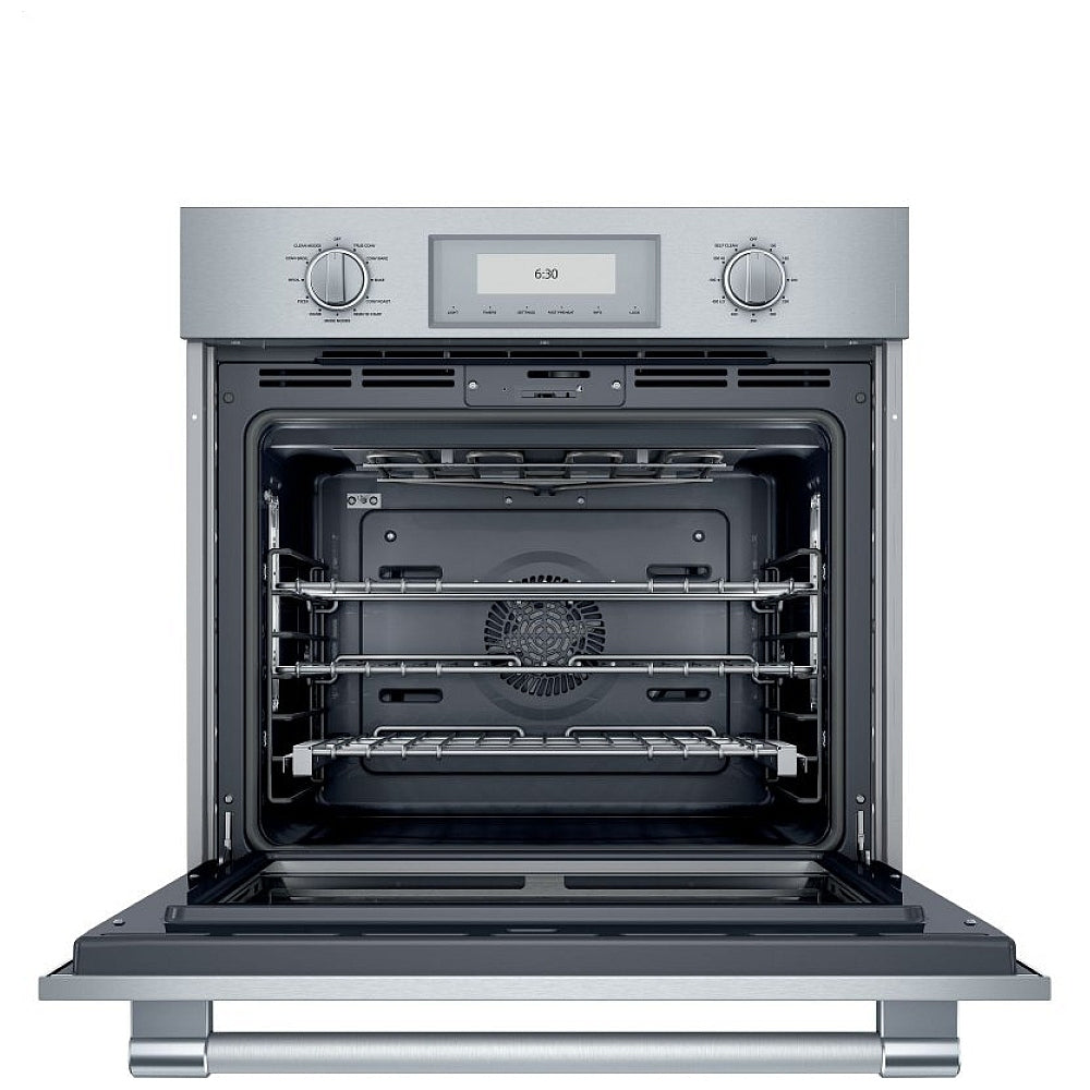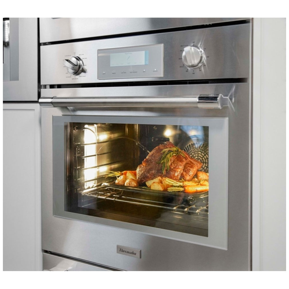 With a spacious 4.5 cu. ft. capacity, the Thermador Professional® Series Built-In Oven is among the largest in its class*. Designed with premium features such as True Convection, telescopic racks, a temperature meat probe, and super-fast preheat, this oven combines advanced performance with a sleek finish in metallic gray glass and stainless steel.